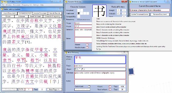 The Character context menu is a local menu that appears when you right-click the character entry frame of the Character Dictionary window. This menu includes several menu items, all of which help you find information about the character in other parts of the program (word lists, dictionaries, documents, etc) or at other websites. Menu items are displayed according to program context; that is, some of them appear differently depending on the current state of the program. These menu items include: