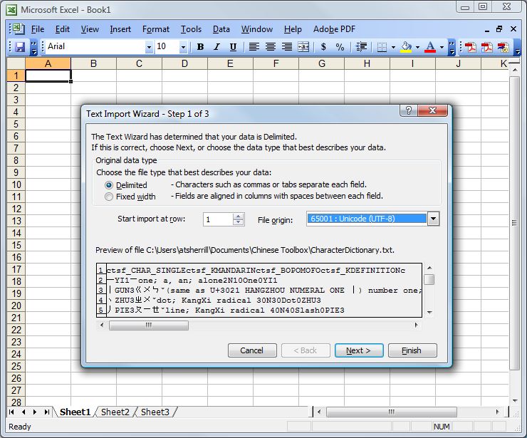 The Excel import wizard will display three dialogs, one after the other. In the first, select “Delimited” for the file type and “65001 : Unicode (UTF-8)” for the file origin, as shown below: