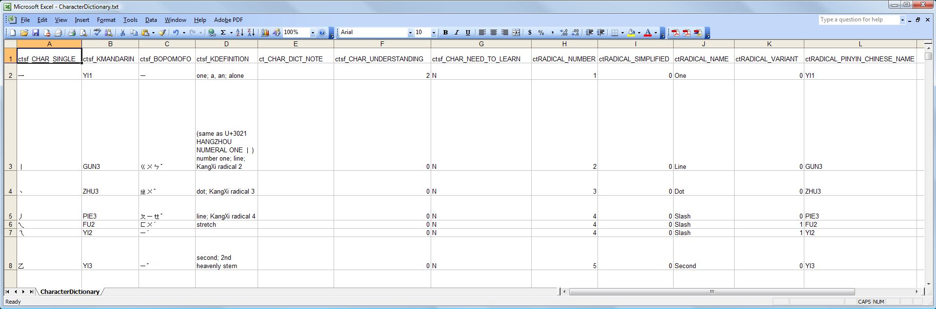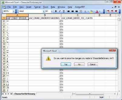CharacterDictionary.txt now contains character understanding data and need to learn data from the original Chinese Toolbox dictionary. However, the file is not yet in the proper format. It still needs to be converted from one Unicode format to another, that is, from UTF-16 to UTF-8. A number of free Unicode text editors are available from various download sites. Two that work for me are BabelPad and TxtEdit. At the time of this writing, the BabelStone web site was down. Just do a search; BabelPad is available from several software download sites.