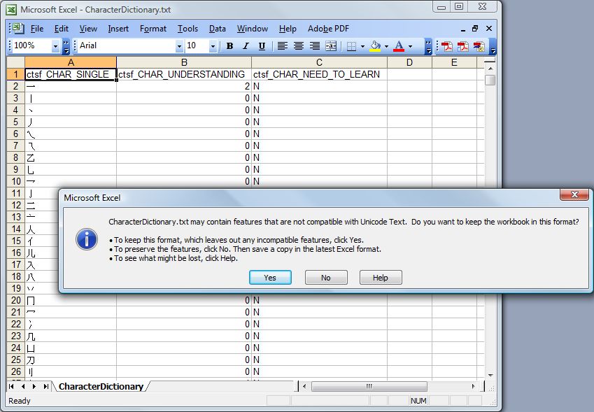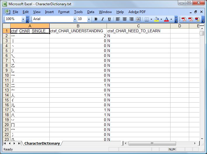 In this guide, I use Microsoft Excel 2003 to remove columns containing dictionary data only, leaving only known and need-to -learn data. After saving the new file in the proper format, it can be moved to another computer. However, Excel 2003 cannot write text files in UTF-8 format. The only Unicode format supported by Excel 2003 is UTF-16. So after saving the file in Excel, I’ll need to use another program to convert it to UTF-8 format. Let’s get started.