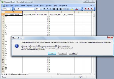 After a few seconds, Excel will display the dictionary file in its window. After a little formatting (wrapping text and widening columns), the Excel window appears as follows: