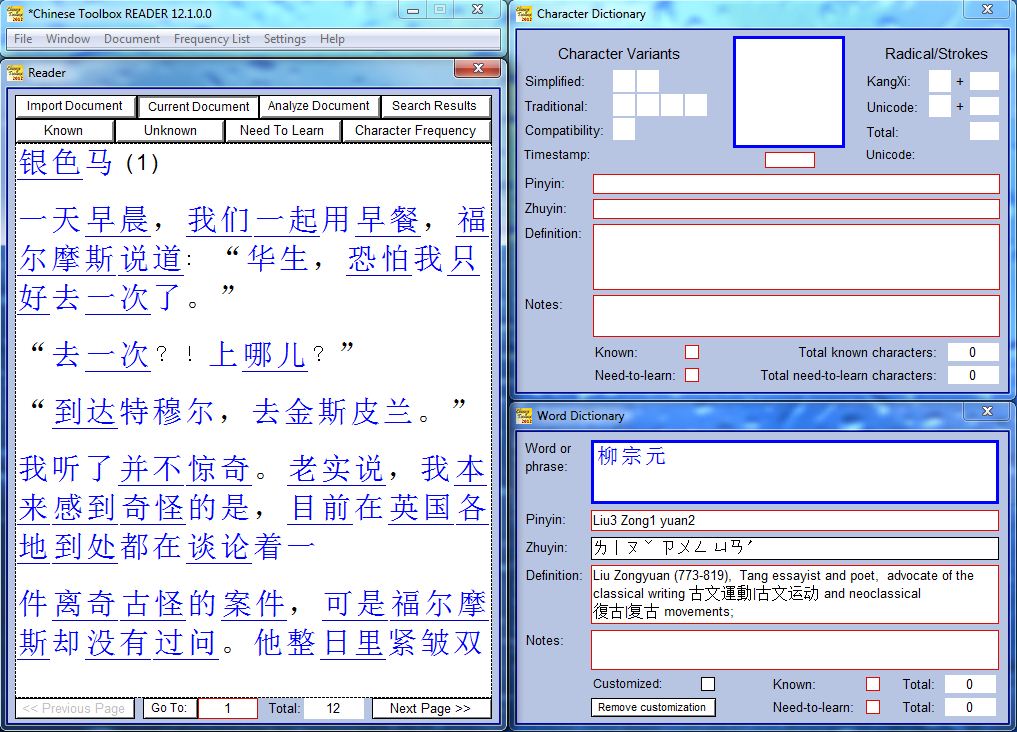 Once you know how to import documents into Chinese Toolbox, and you understand the relationship between selecting characters in the Reader and the display of dictionary definitions, there is so much more you can do with Chinese Toolbox. Here’s a list of things you might be interested in: